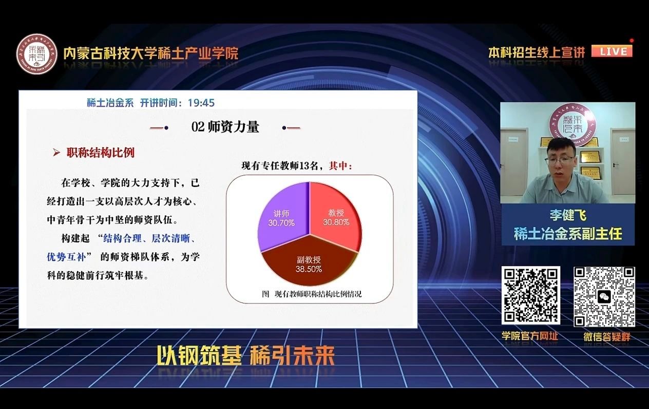 直播课堂上,老师以详实的数据与生动的案例,充分展现了学院的雄厚团队储备。既有国家杰青领衔的稀土磁性材料创新团队,也有省级教学名师主导的课程开发小组,全方位展示了“教学+科研”双轨并行的团队优势。同时,围绕稀土资源高效利用、纳米复合材料性能优化等专业问题,老师们结合产学研合作经验,分享了从理论教学到实践应用的完整培养体系,让观众深切感受到学科发展的强劲动力。