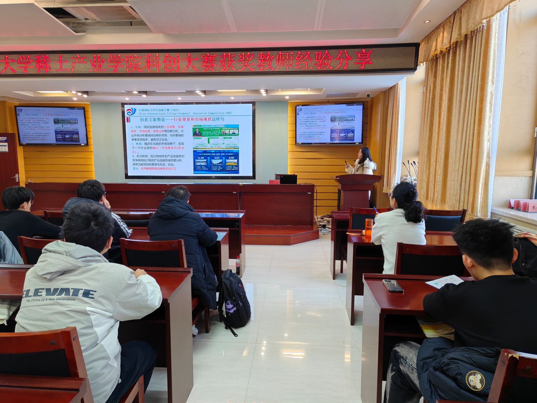 许欣老师围绕 “沙漠碳库” 项目的挖掘、培育及获奖历程展开,详细介绍了该项目聚焦荒漠化治理瓶颈,构建固沙保水促生一体化生态治理技术体系,以国际首创 3D 沙漠碳捕集与碳封存一体化方案斩获国赛银奖的全过程,并分享了项目运作与参赛备赛核心技巧。她鼓励同学们立足专业、关注社会需求,勇于投身科创实践与赛事比拼。现场老师们就提升参赛质量展开深入研讨交流。